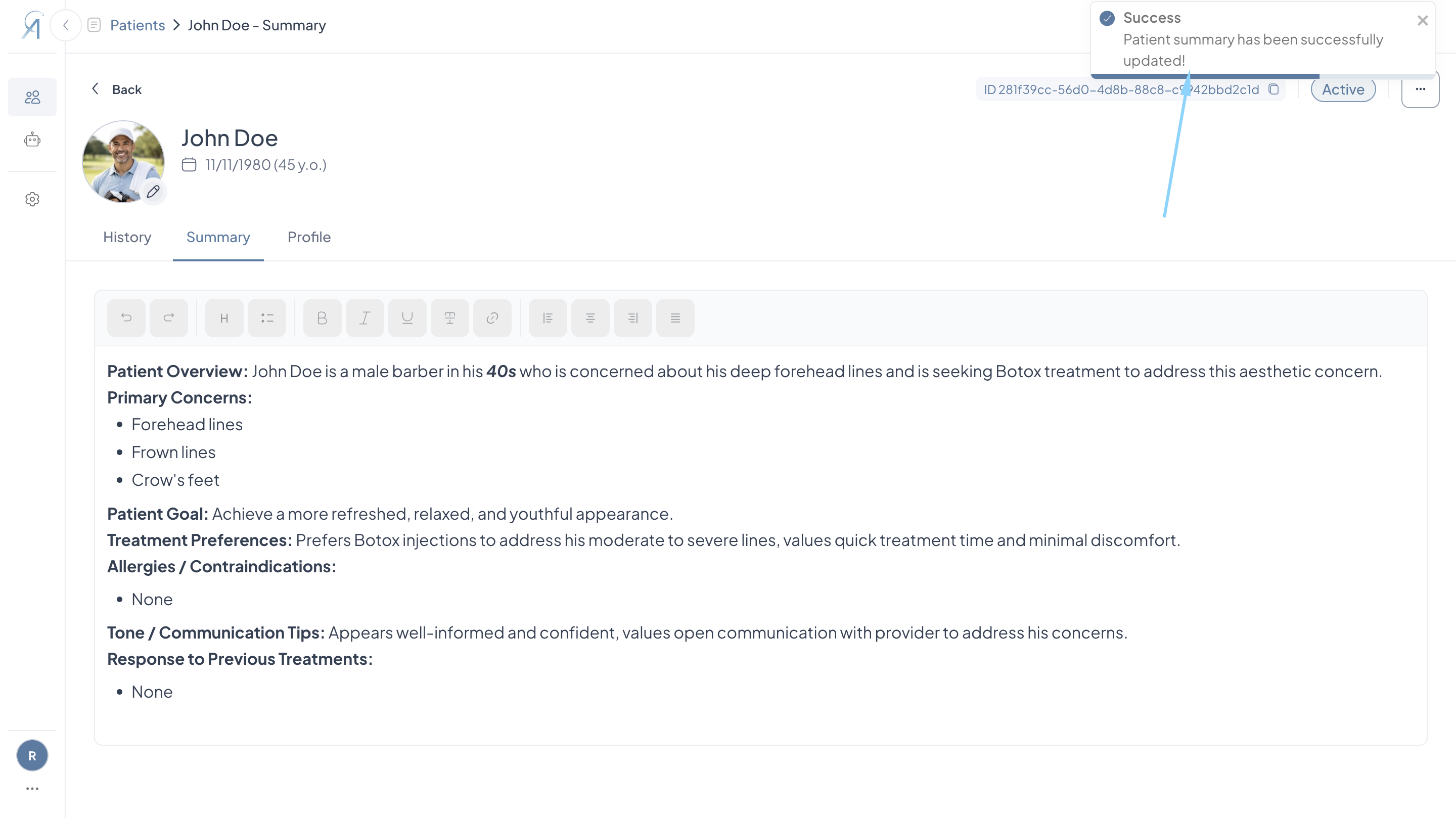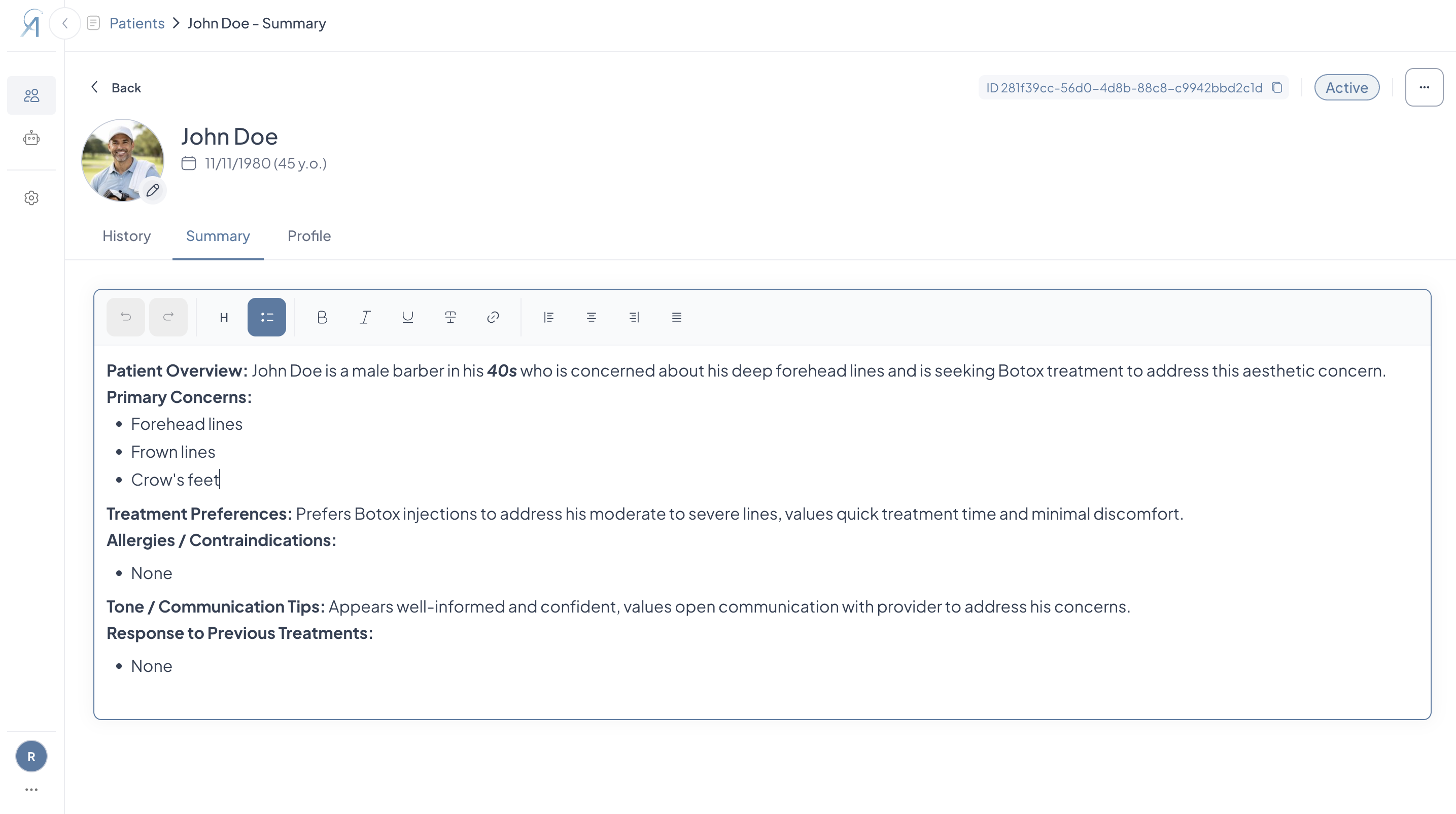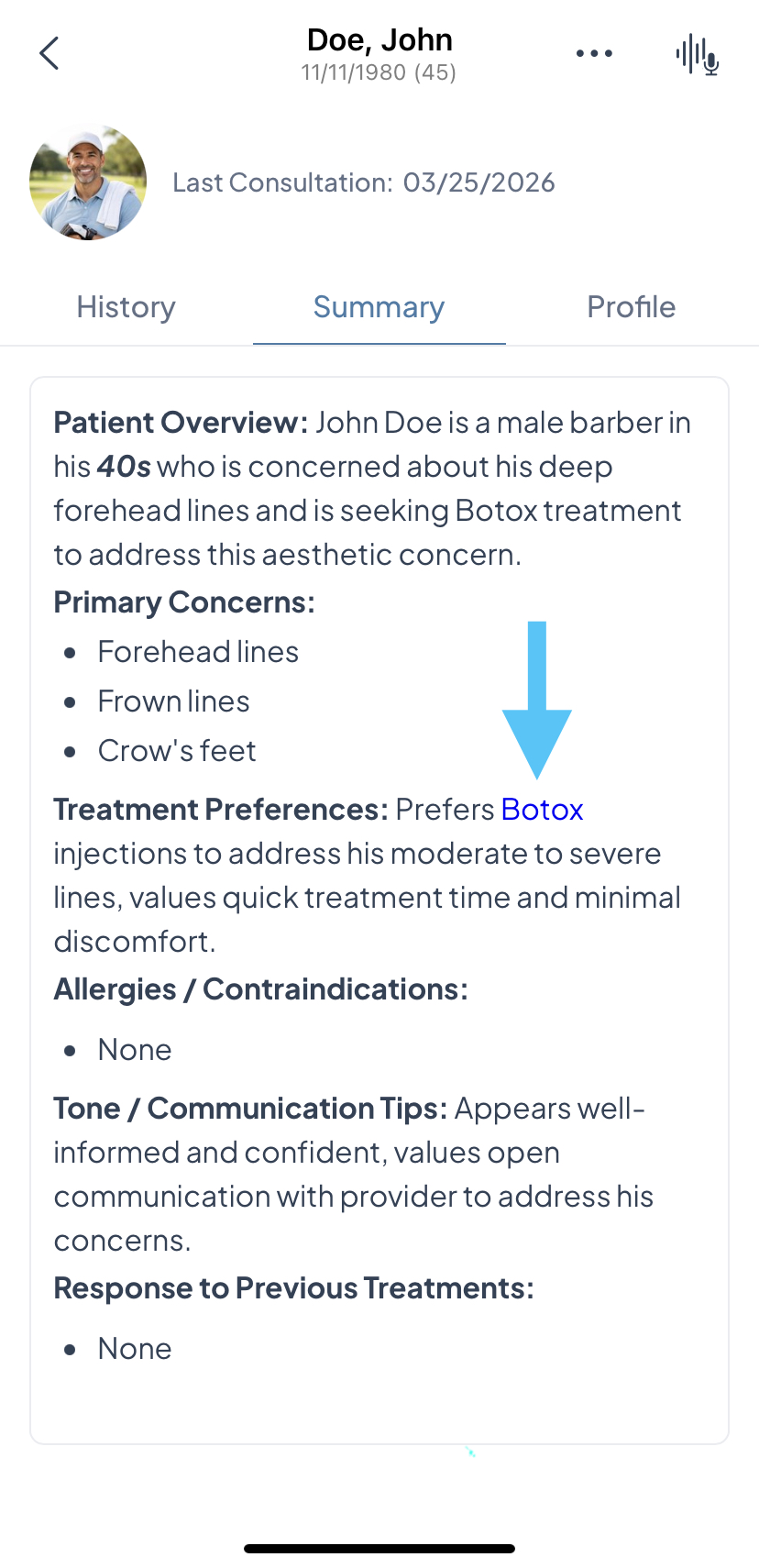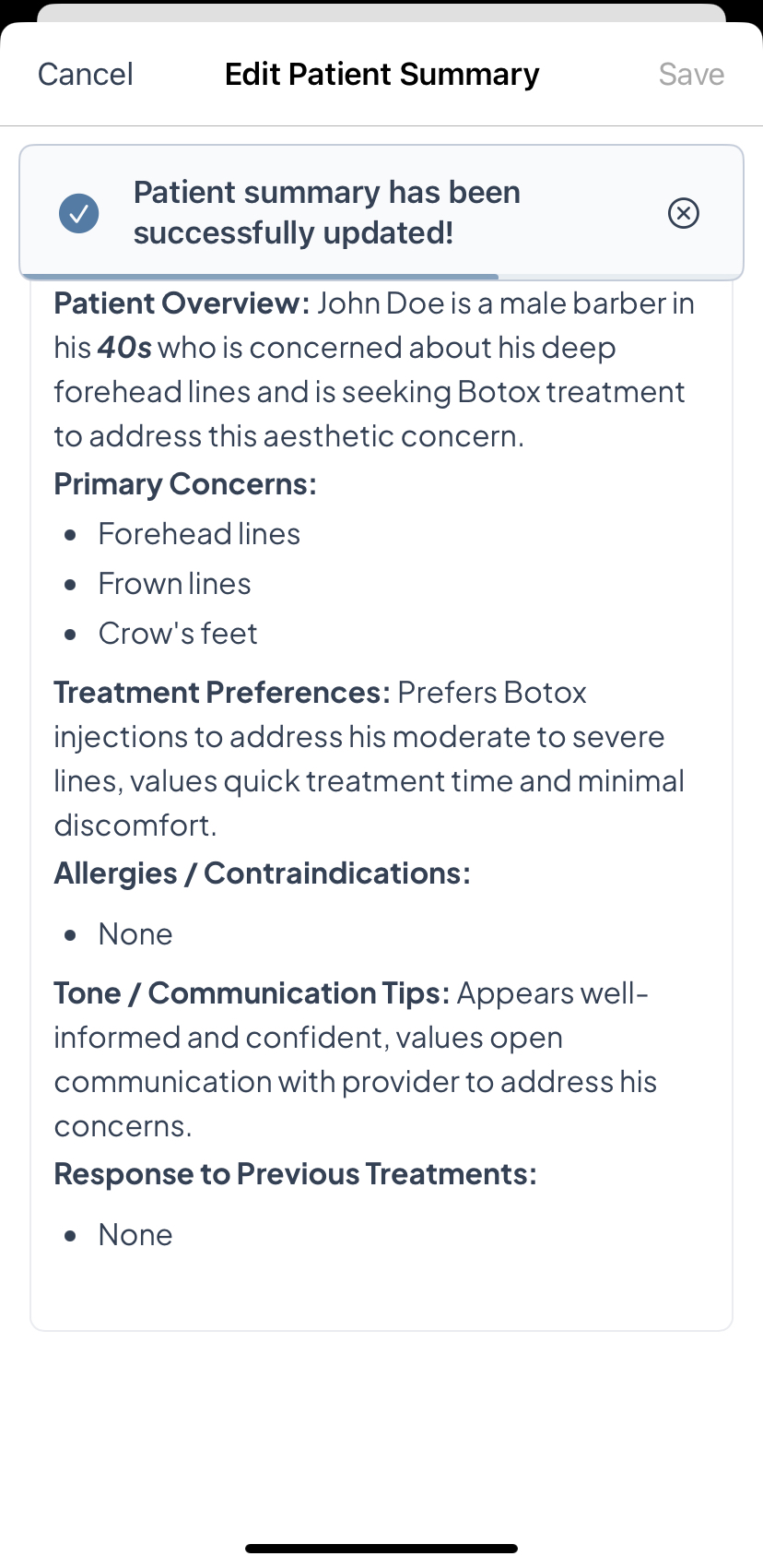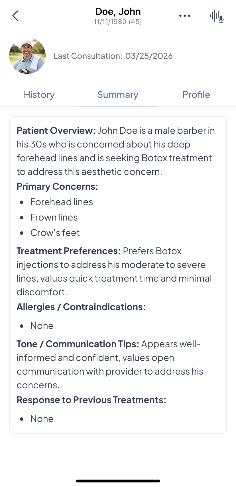 - Once at least one live consultation has been completed, Aesthetics360 automatically generates a Patient Summary capturing the patient's primary concerns, treatment preferences, allergies or contraindications, past treatment responses, and communication tips, giving you a quick read on the patient before their next visit.