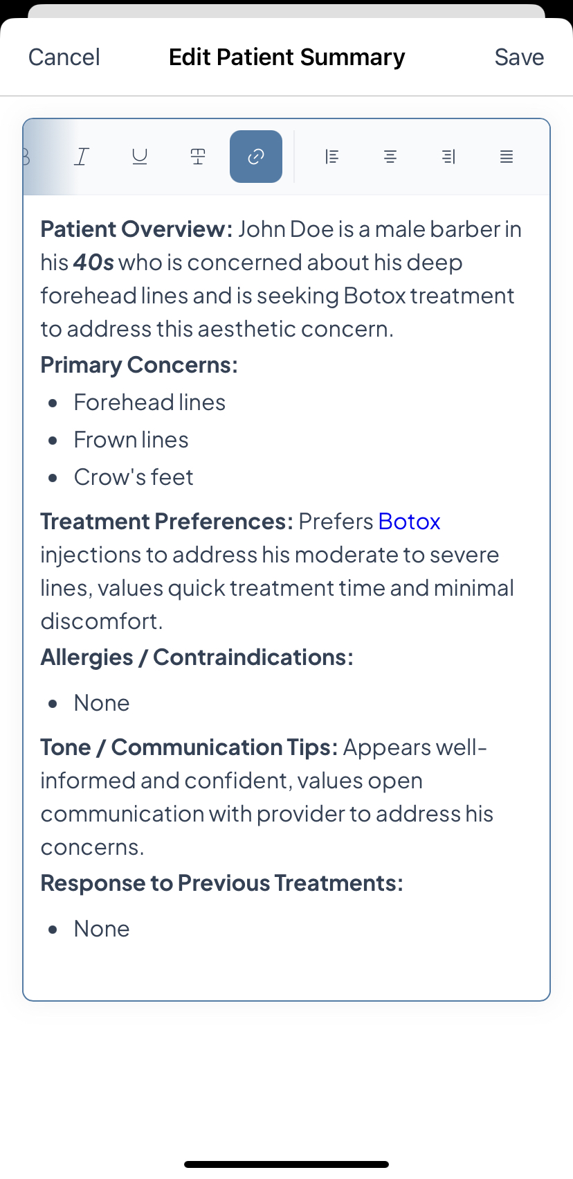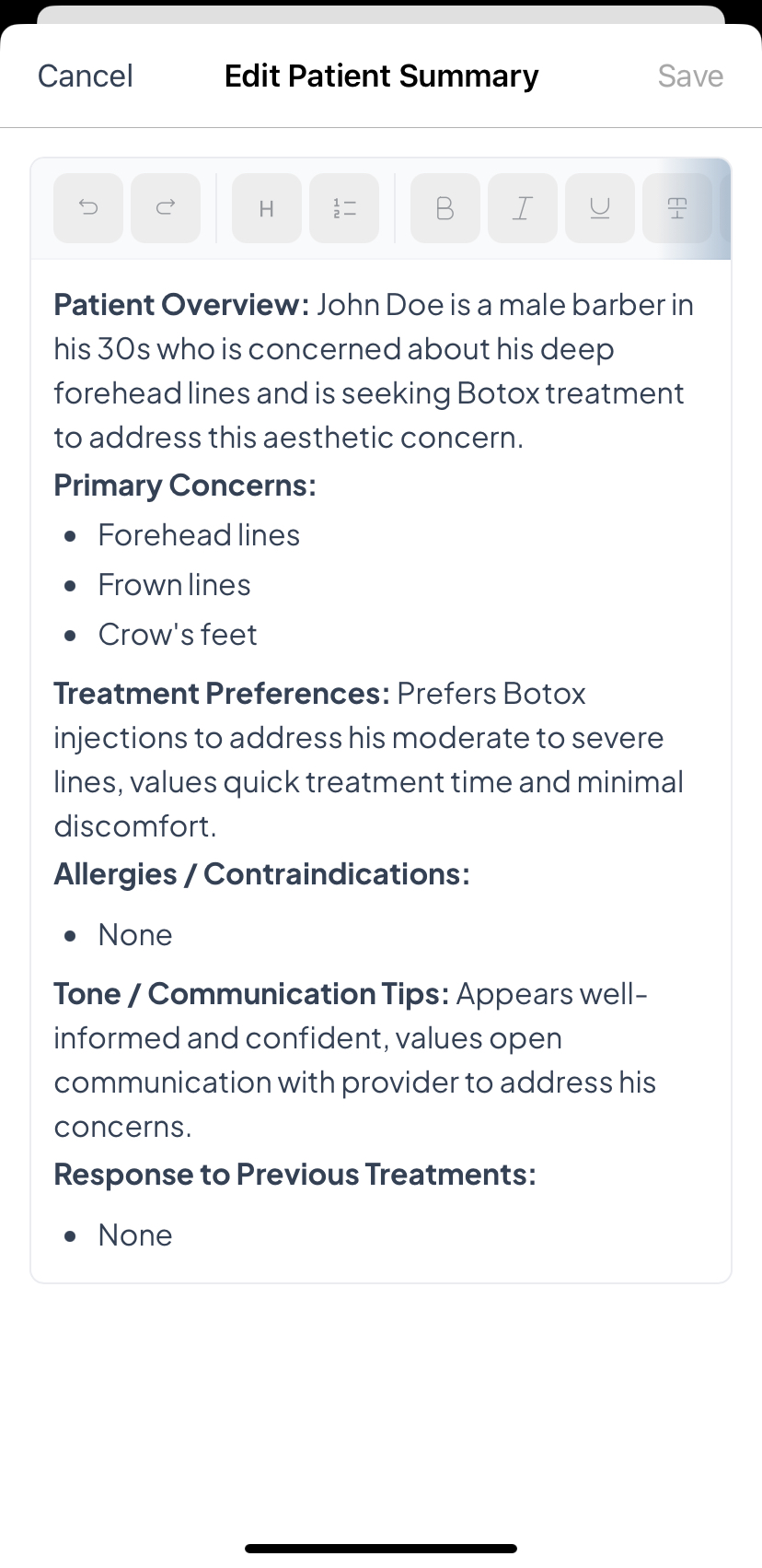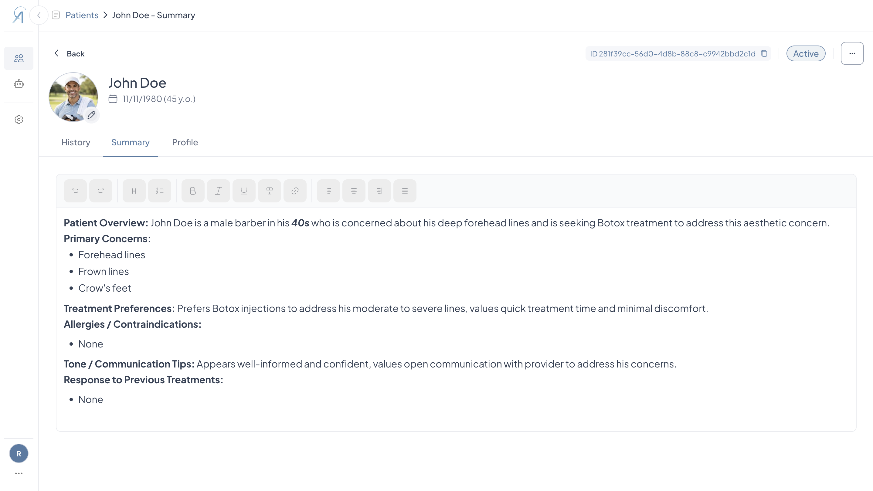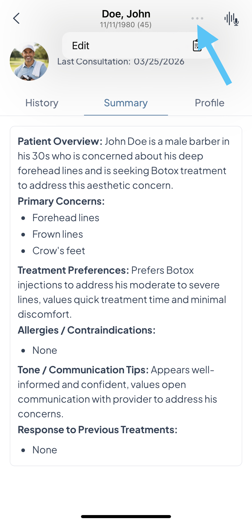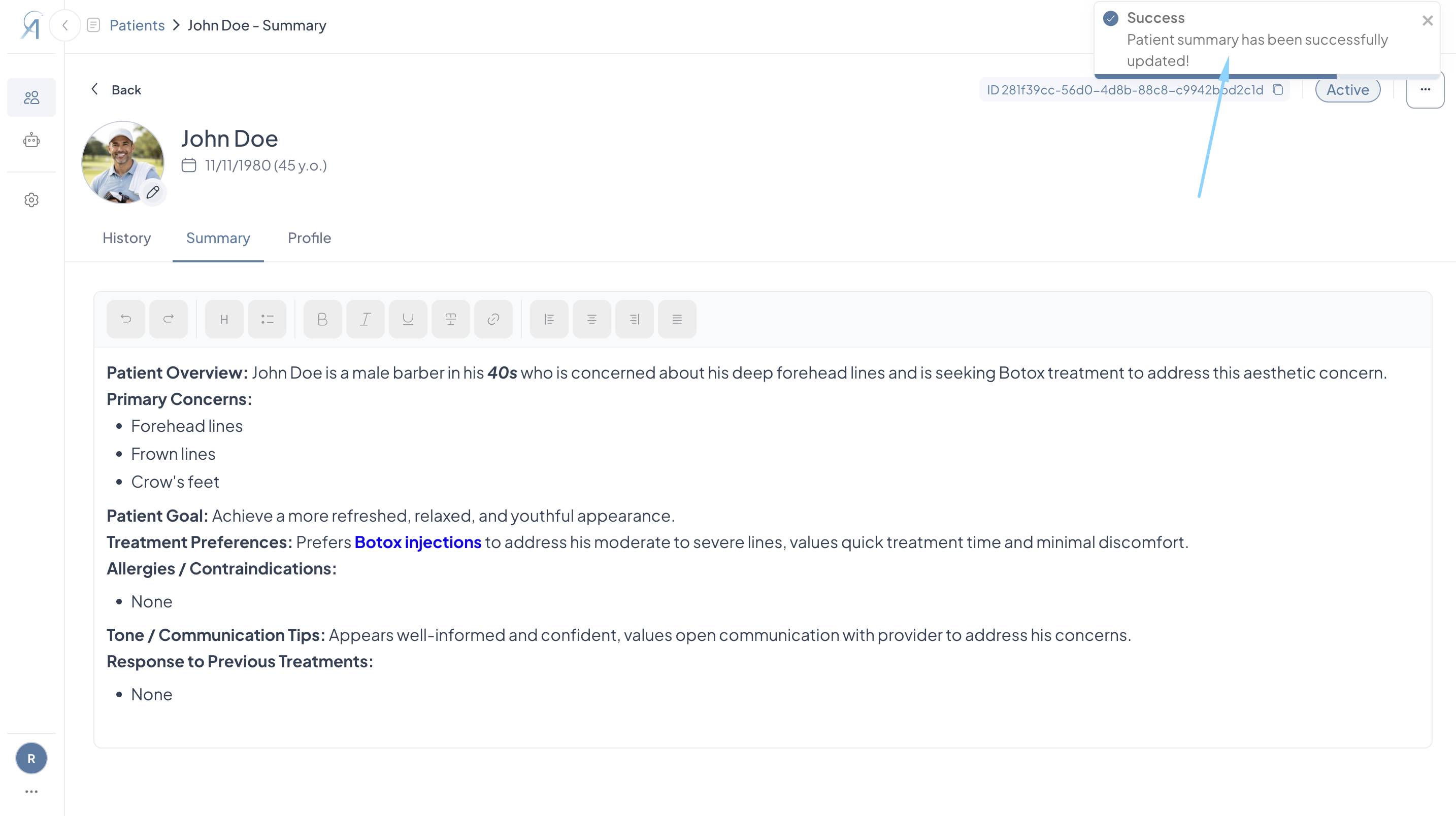 - Once at least one live consultation has been completed, Aesthetics360 automatically generates a Patient Summary capturing the patient's primary concerns, treatment preferences, allergies or contraindications, past treatment responses, and communication tips, giving you a quick read on the patient before their next visit.