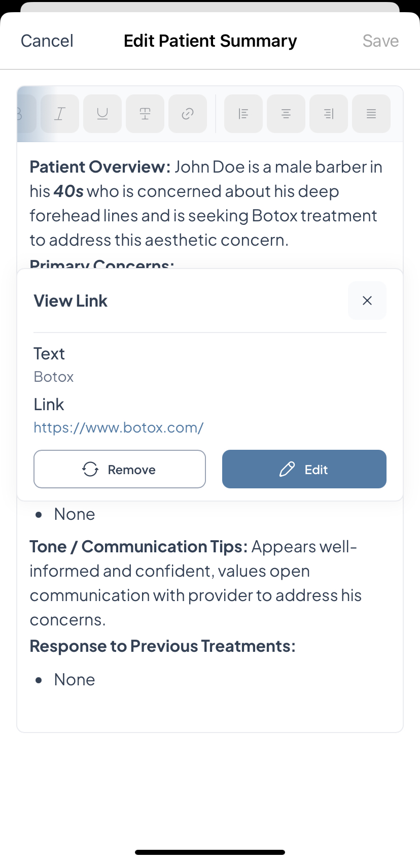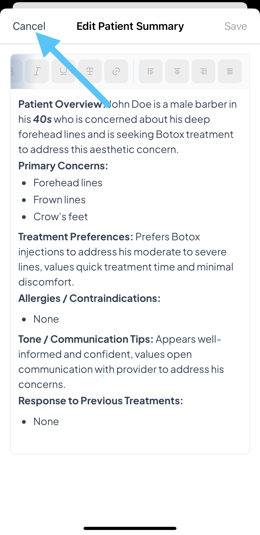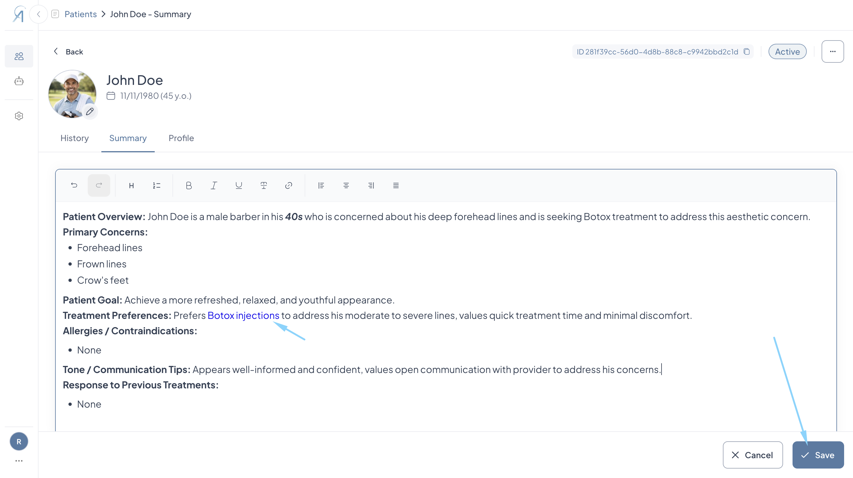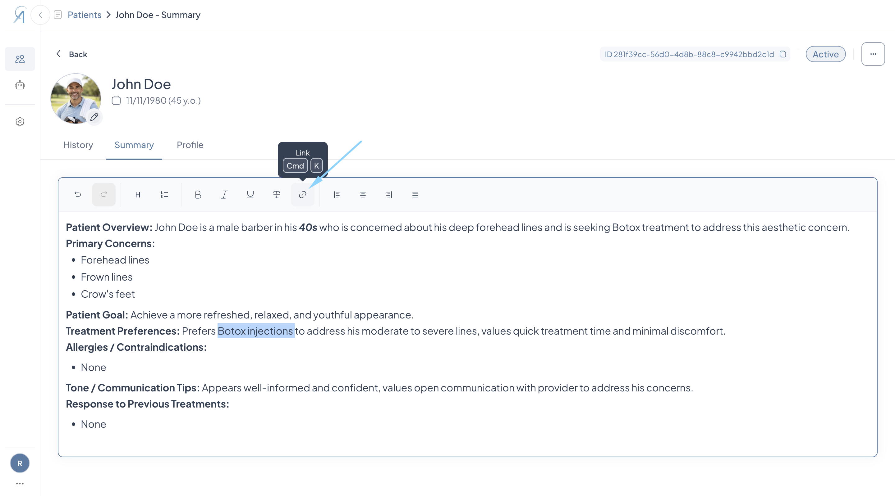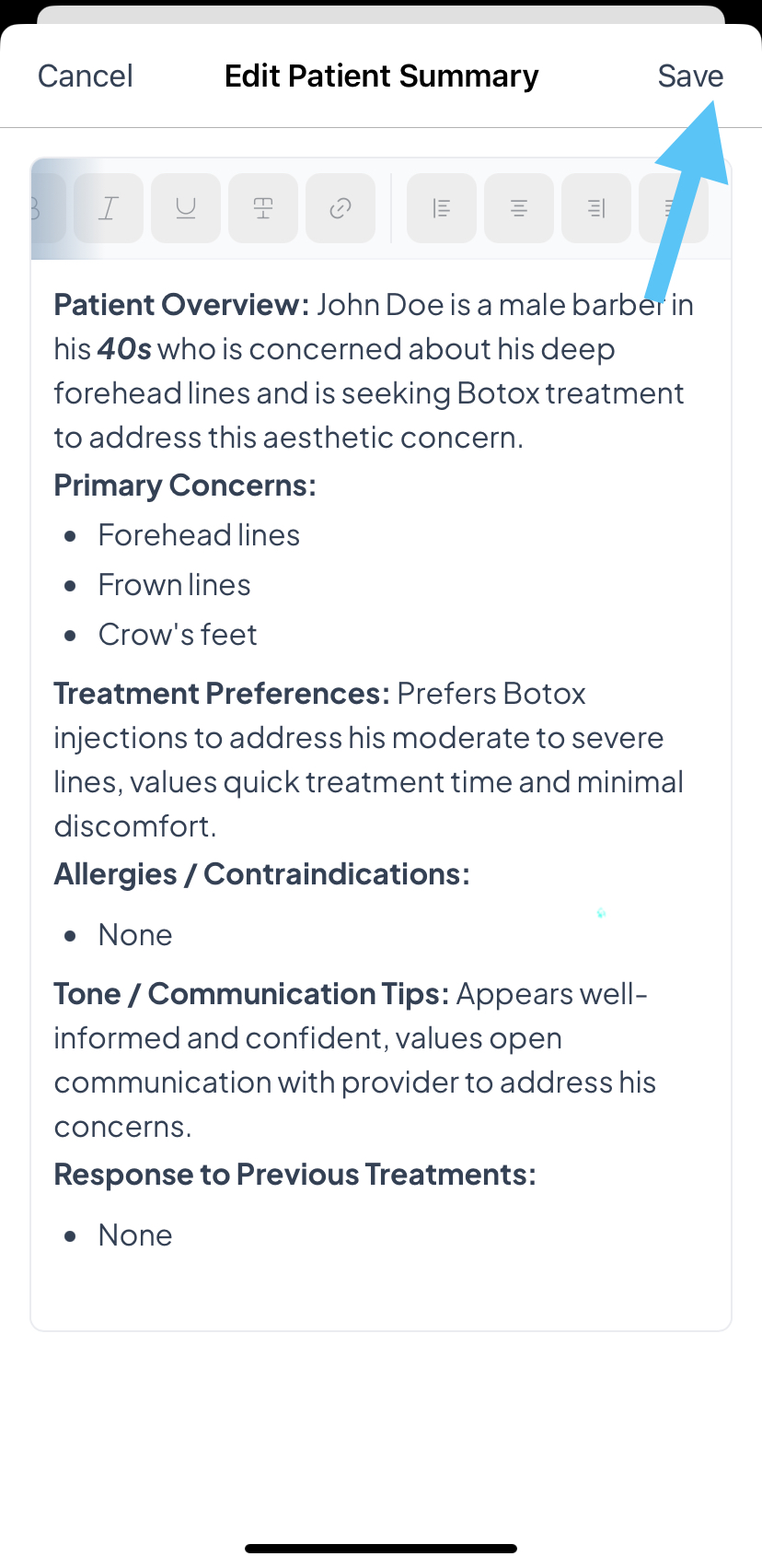 - Once at least one live consultation has been completed, Aesthetics360 automatically generates a Patient Summary capturing the patient's primary concerns, treatment preferences, allergies or contraindications, past treatment responses, and communication tips, giving you a quick read on the patient before their next visit.