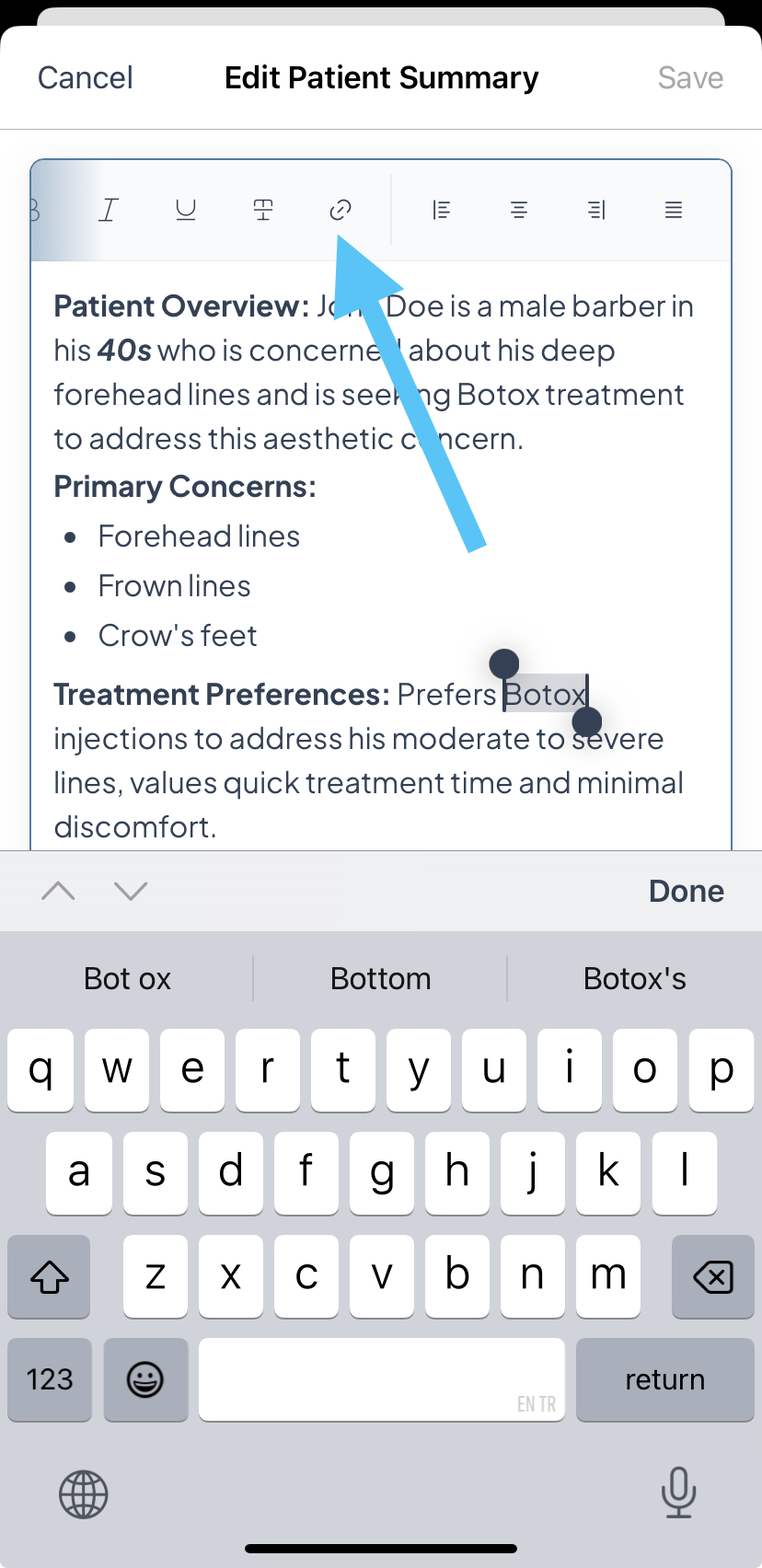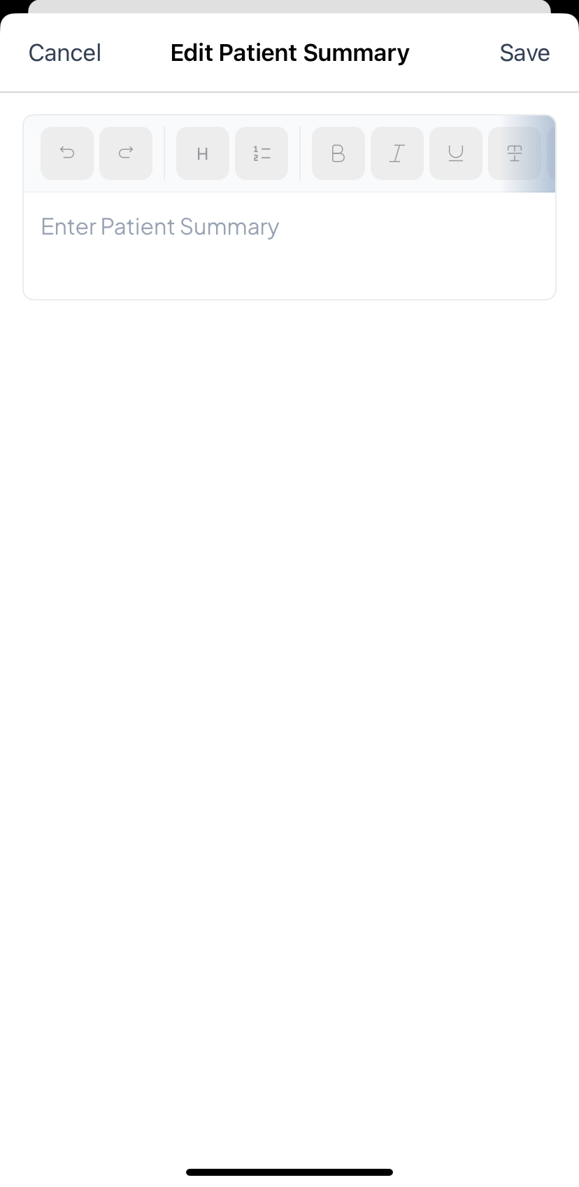 When you tap the text field to edit the summary, a toolbar appears at the top with tools to help you format the content. The toolbar scrolls left and right — swipe it to see all available options.