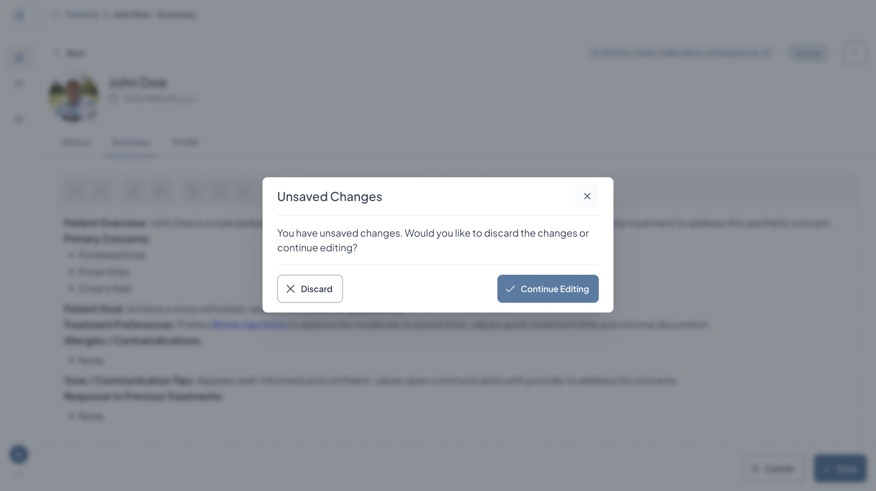- Click Continue Editing or the X to return to editing the Patient Summary
