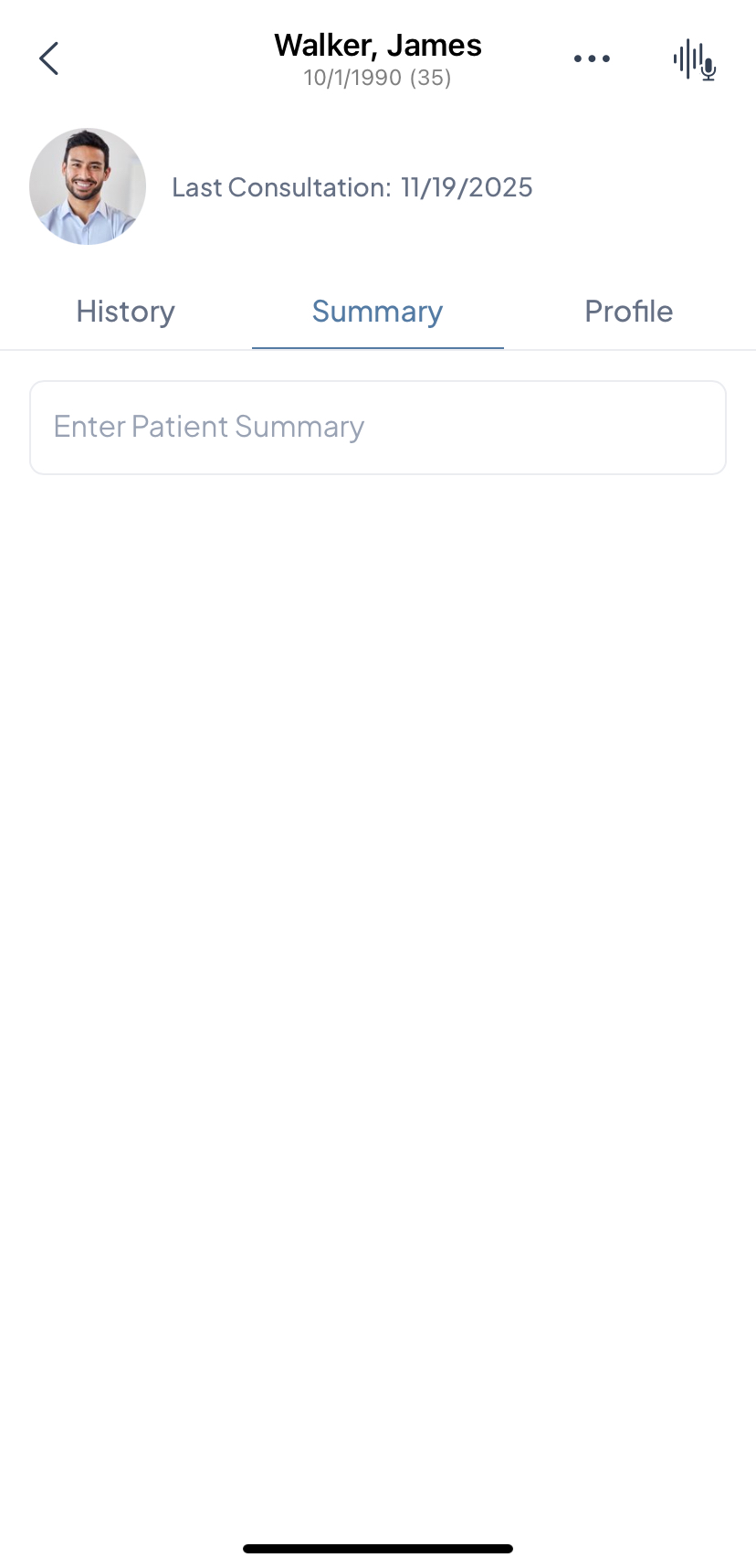- Patient Summary is an AI-generated overview based on consultation history.